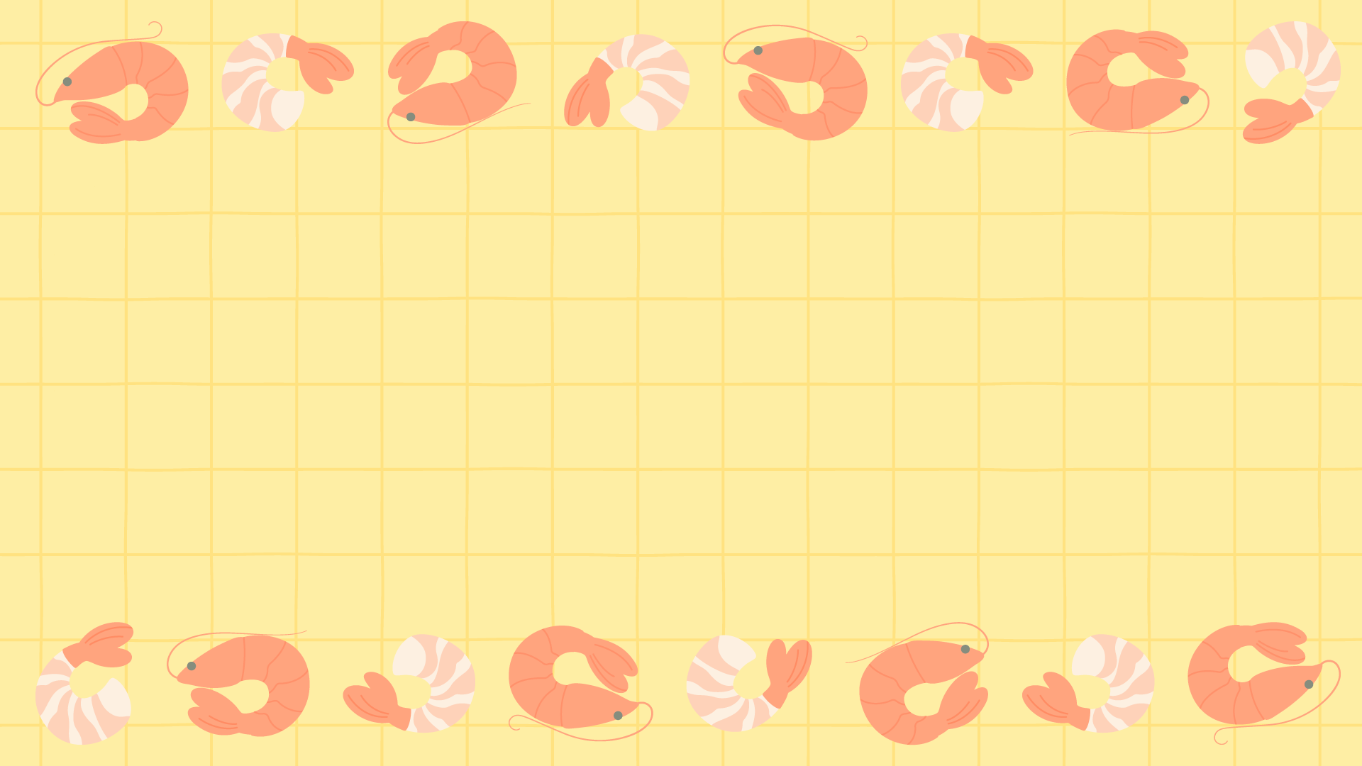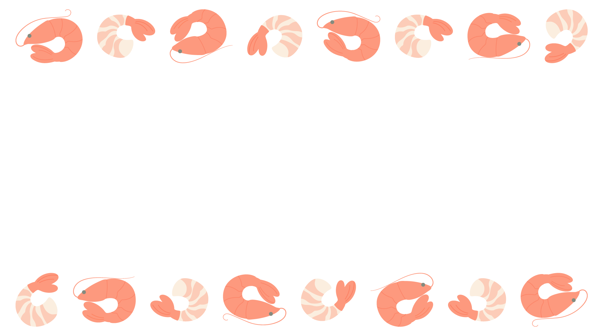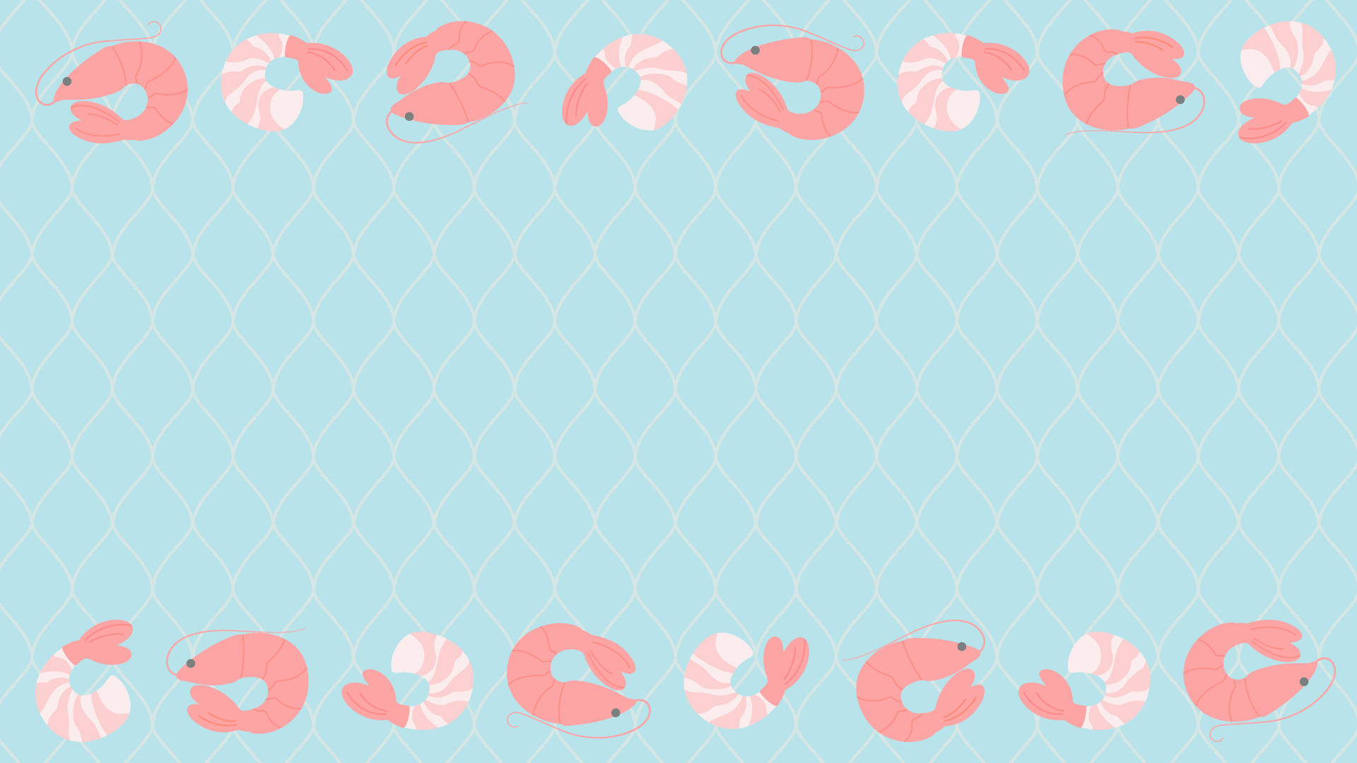 プリプリとした茹であがったえびの殻付きと剥きえびと背景には網目模様のえび好きをイメージした背景素材です。「オレンジ色のえびと四角の網模様で黄色の明るくかわいい背景素材」と「ピンク色のえびと網目模様の水色の爽やかな背景素材」と「えびの背景なし」の3種類のえびの素材をイメージしました。画像サイズは 1920px × 1080pxのpngデータです。広告やwebの素材、動画の素材やタイトルの周りのあしらいなどご自由にお使いください。