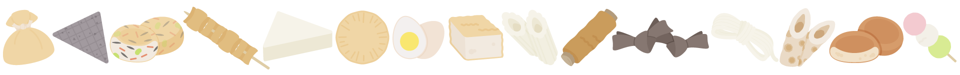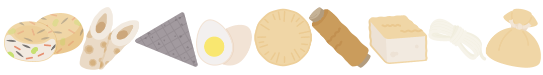 もち巾着、こんにゃく、がんもどき、牛すじ、はんぺん、大根、たまご、厚揚げ、ちくわぶ、ごぼ天、しらたき、ちくわ、さつま揚げ、三食串天などいろんな種類のおでんの飾り枠イラストです。 チラシ、広告やwebの素材、動画の素材やタイトルの周りのあしらいなどご自由にお使いください。
