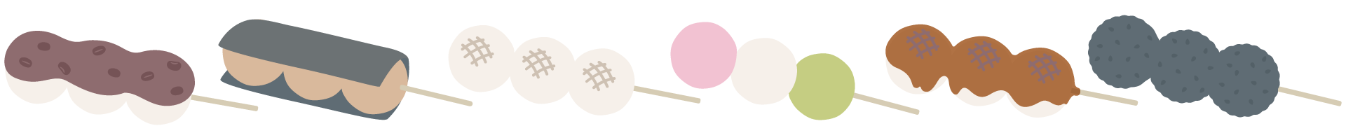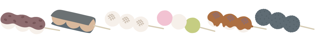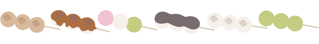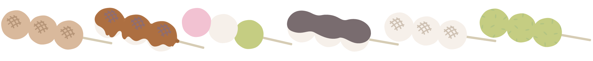 粒あん、海苔、三色だんご、みたらしだんご、ごまだんご、こしあんだんご、よもぎだんごなどいろんな種類のお団子の和の飾り枠イラストです。 チラシ、広告やwebの素材、動画の素材やタイトルの周りのあしらいなどご自由にお使いください。