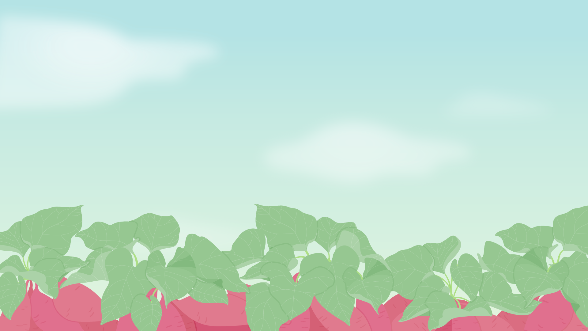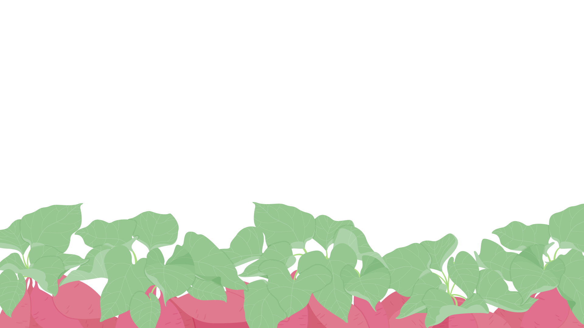 たくさんのさつまいもが実った秋の畑の背景素材です。「赤紫色のさつまいもがたくさん実った畑とくもが浮かんだ青い昼のそら」と「夕日に照らされて濃くなったさつまいも畑と少し切なくなる夕焼けのそら」と「背景画像が透過したさつまいも畑」の3種類のさつまいも畑をイメージしました。