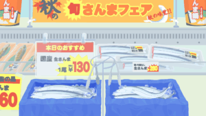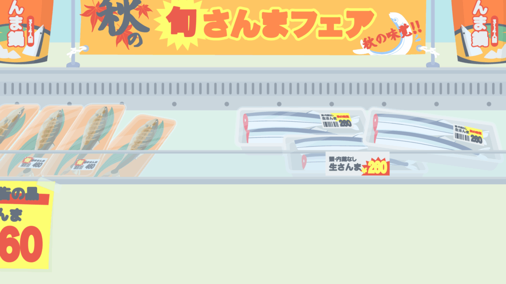 スーパーのさんま売り場の背景素材です。「生のさんま、さばいたさんま、焼いたさんまなどさまざまなさんまが置かれているスーパの売り場」と「スーパーの背景素材」と「さんまがたくさん入った売り場の背景なし」の3種類のさんまの売り場をイメージしました。