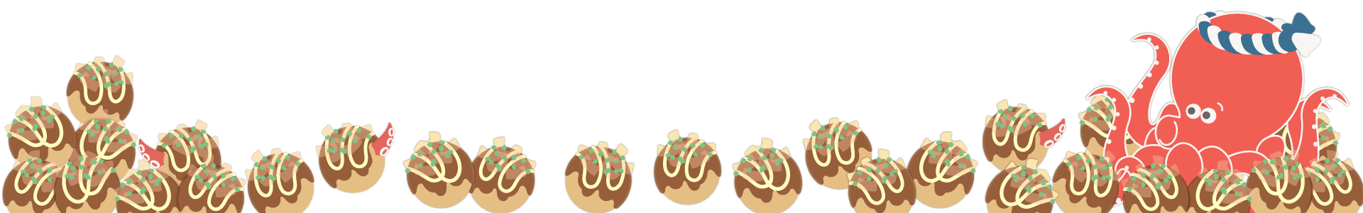 ハチマキをつけたたこのイラストとたくさんのたこ焼きの飾り枠イラストです。 チラシ、広告やwebの素材、動画の素材やタイトルの周りのあしらいなどご自由にお使いください。