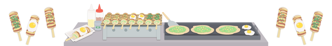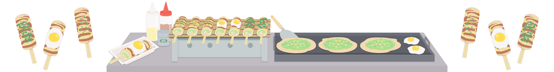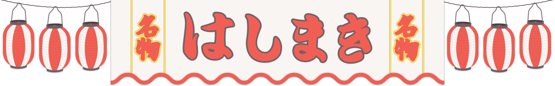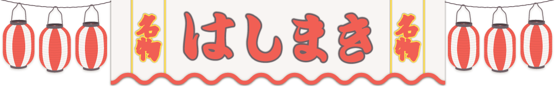 お祭りの赤い提灯と白色のレトロな垂れ幕、キャベツなどがぐるぐるに巻かれたはしまきの屋台の飾り枠イラストです。 チラシ、広告やwebの素材、動画の素材やタイトルの周りのあしらいなどご自由にお使いください。