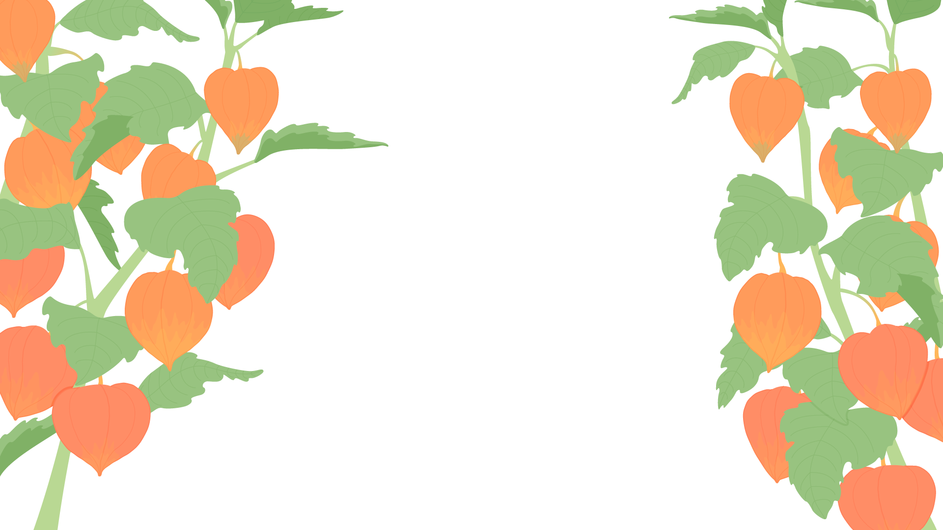 オレンジ色に実った提灯のようなほおずき、秋の植物の背景素材です。「ピンク色のかわいいほおずきとくもが広がった薄いそら」と「オレンジ色の綺麗なほおずきと日が沈んでいく夕方のオレンジ色のせつないそら」と「背景画像が透過したオレンジ色のほおずき」の3種類のほおずきをイメージしました。