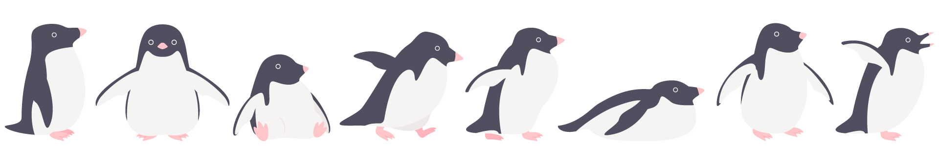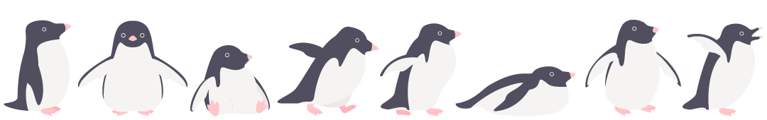 真っ黒で目がくりくりとしたアデリーペンギンの座ったり、走ったり、寝そべったりしている飾り枠イラストです。 チラシ、広告やwebの素材、動画の素材やタイトルの周りのあしらいなどご自由にお使いください。