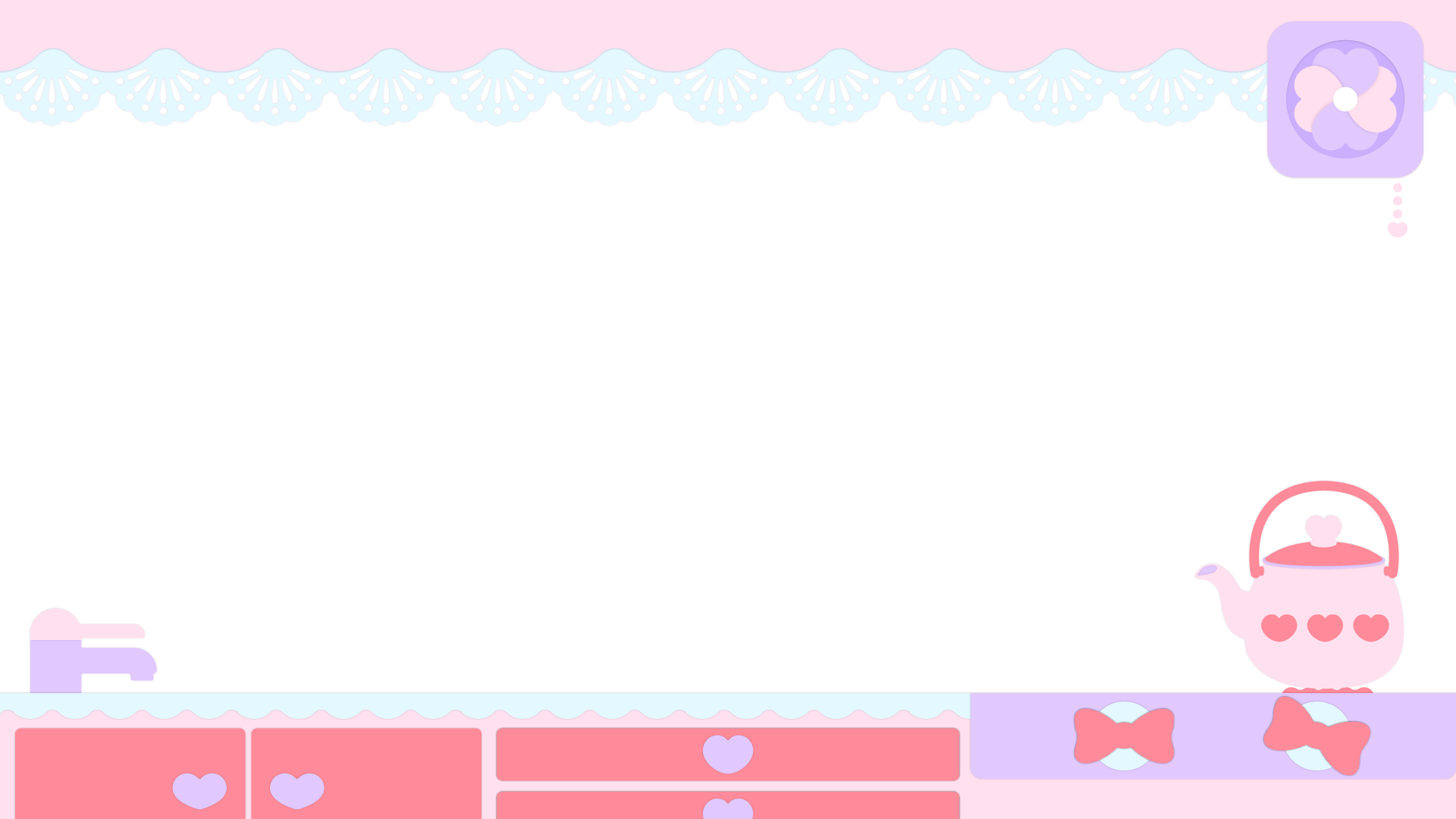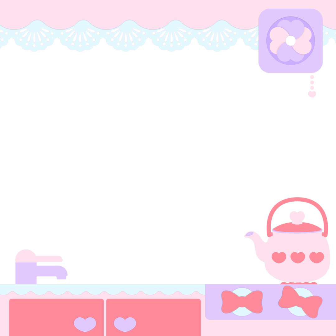 ハートとリボンのかわいいキッチンの飾り枠イラストです。 チラシ、広告やwebの素材、動画の素材やタイトルの周りのあしらいなどご自由にお使いください。