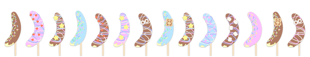 カラースプレー、ラムネ、マシュマロ、クッキーなどが飾られた屋台によくあるかわいいチョコバナナの飾り枠イラストです。 チラシ、広告やwebの素材、動画の素材やタイトルの周りのあしらいなどご自由にお使いください。