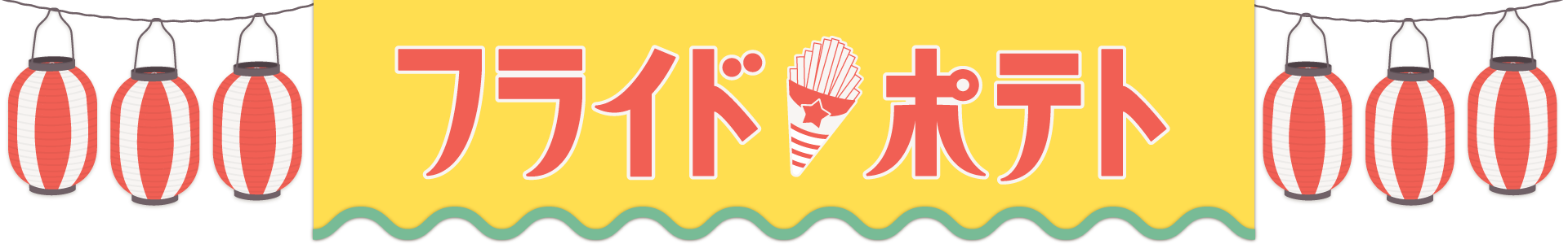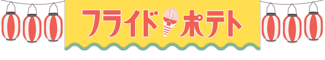 お祭りの赤い提灯と黄色のポップな垂れ幕、油で揚げたてのアツアツの美味しそうなポテト屋台の飾り枠イラストです。 チラシ、広告やwebの素材、動画の素材やタイトルの周りのあしらいなどご自由にお使いください。