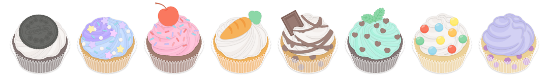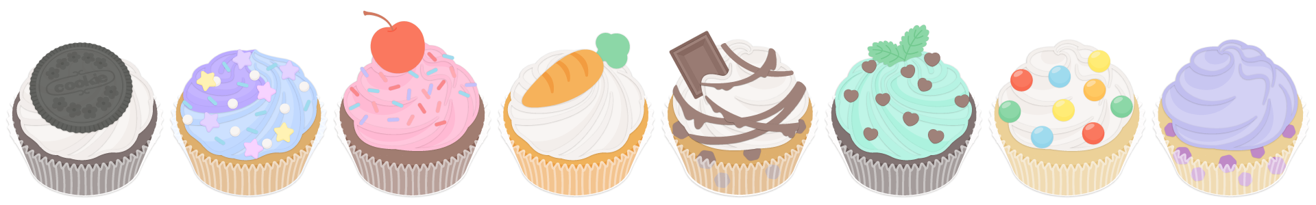 クッキー&クリーム、ギャラクシー、チェリー、にんじん、チョコ、チョコミント、マーブル、ブルーベリーなどいろんな種類の生クリームたっぷりのマフィンの飾り枠イラストです。 チラシ、広告やwebの素材、動画の素材やタイトルの周りのあしらいなどご自由にお使いください。