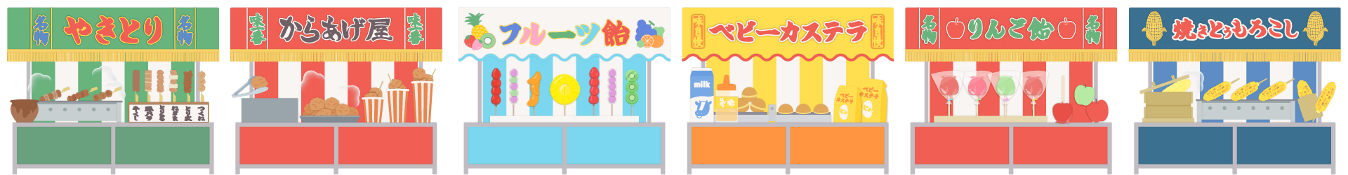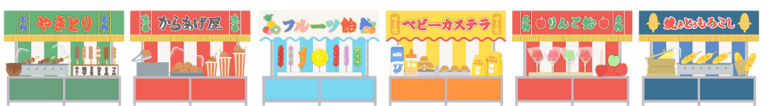 お祭りの焼き鳥、唐揚げ、フルーツ飴、ベビーカステラ、りんご飴、焼きとうもろこしなどの屋台の飾り枠イラストです。 チラシ、広告やwebの素材、動画の素材やタイトルの周りのあしらいなどご自由にお使いください。