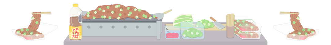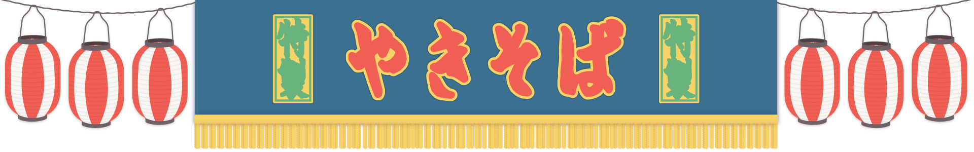 お祭りの赤い提灯と紺色のレトロな垂れ幕、鉄板で焼かれたキャベツとお肉だけのシンプルな昔ながらの屋台の焼きそばの飾り枠イラストです。 チラシ、広告やwebの素材、動画の素材やタイトルの周りのあしらいなどご自由にお使いください。
